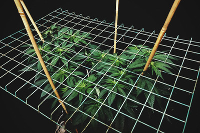 ScrOG: implica una malla con aberturas suficientemente grandes para que pasen las hojas y ramas de las plantas. Puedes hacerlo con alambre para vallas o un enrejado de plástico, o con alambres y cuerdas fijados a una estructura. El objetivo de la pantalla o red es llevar continuamente hacia abajo las ramas en crecimiento para que se desarrollen en un único nivel plano. Lo que hubieran sido ramas laterales subdesarrolladas con cogollos apenas formados se convierten en ramas sanas y robustas con mucha exposición a la luz y unas flores muy densas.
